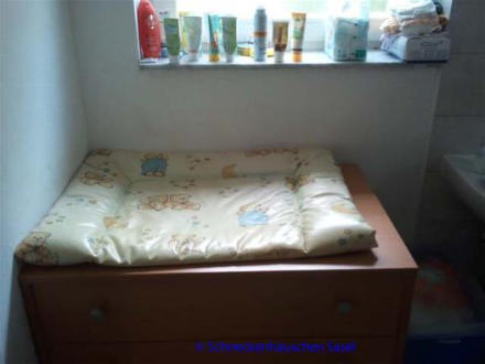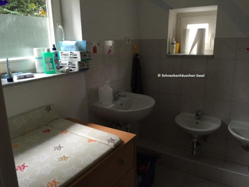 Unser Badezimmer mit Wickelkommode und kindergerechten Sanitäreinrichtungen.